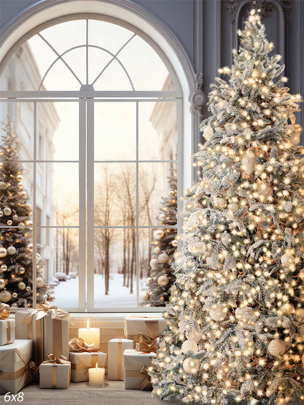 A stately arched window opens to a quiet winter street while frosted trees, twinkling lights, candles, and neatly wrapped gifts glow in soft ivory and gold. The look is elegant and timeless—perfect for family holiday minis, luxe Christmas cards, couples, maternity, and children’s portraits.