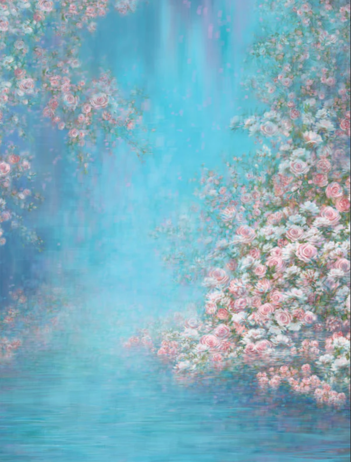 A dreamy, painterly backdrop awash in serene aqua with whispery mist and the soft reflection of water. Cascades of blush roses frame the scene, giving every portrait a romantic, fairytale glow and luminous skin tones. Lovely for maternity, quinceañeras, birthdays, couples, children, and ethereal fine-art headshots.