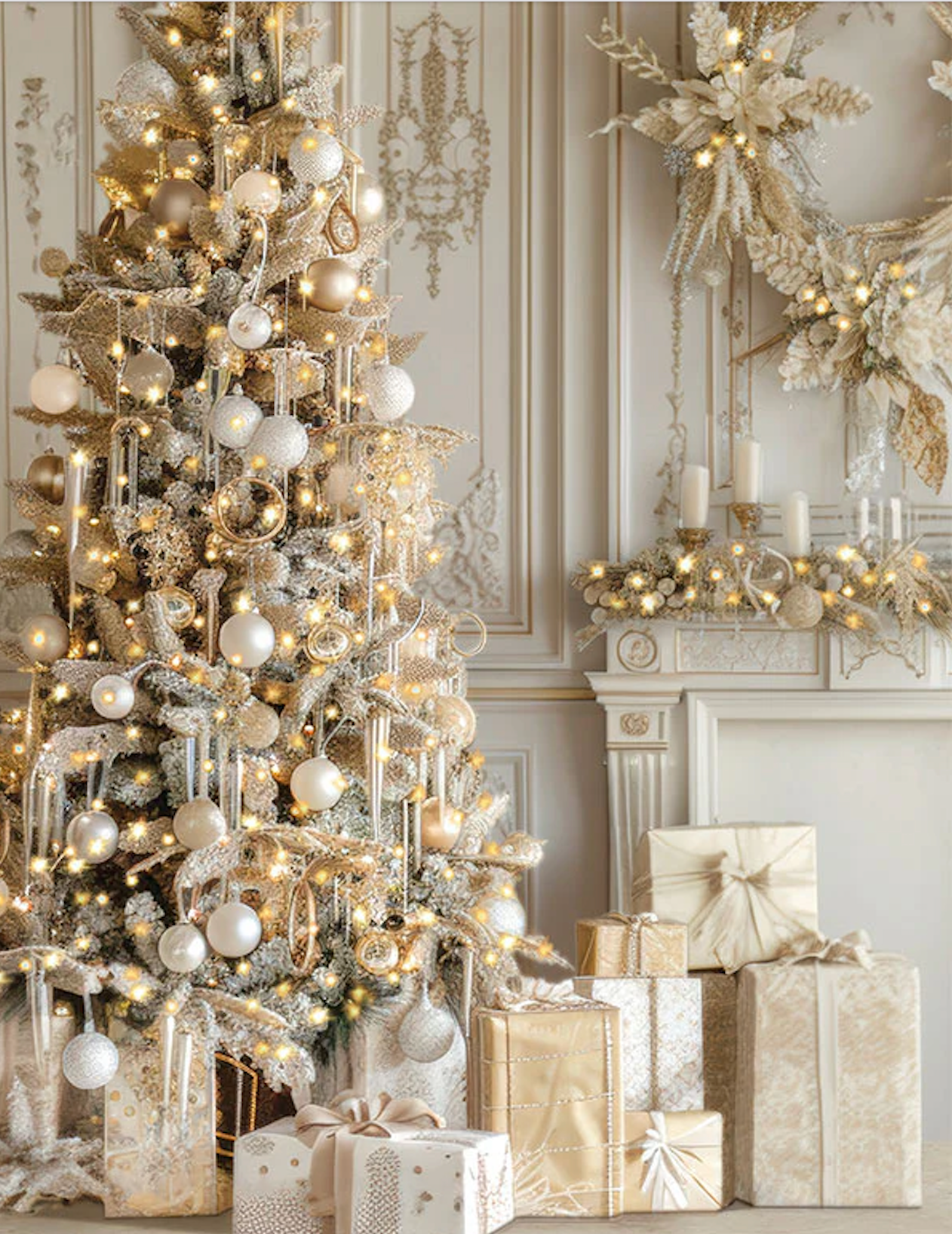 An opulent winter scene with a snow-kissed tree, twinkling lights, gilded ornaments, wrapped gifts, and ornate paneling. The soft whites and champagne gold create luminous, magazine-worthy portraits—perfect for family holiday minis, couples, maternity, children, and luxe Christmas card sessions.