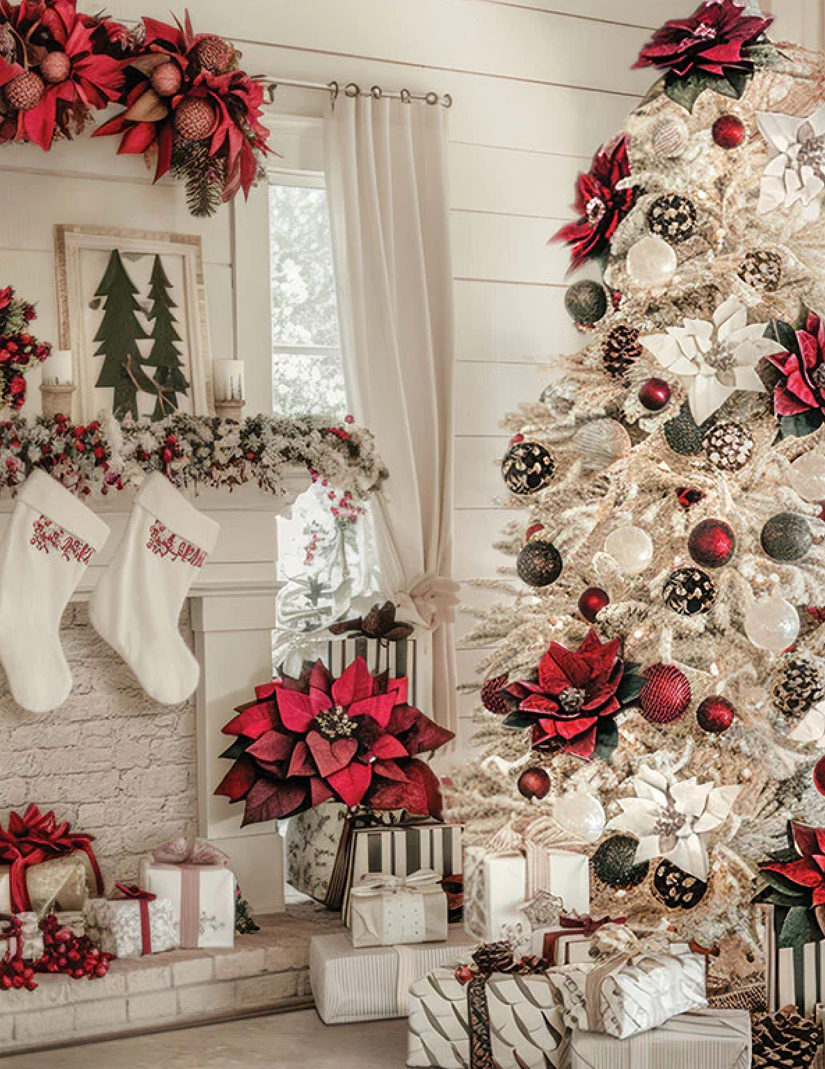 A cozy holiday living room with a whitewashed hearth, knit stockings, and a snow-kissed tree dressed in crimson poinsettias, pinecones, and twinkling lights. Wrapped gifts and soft window light create a nostalgic, storybook feel—perfect for family holiday minis, kids in matching pajamas, couples, maternity, and festive Christmas card portraits.