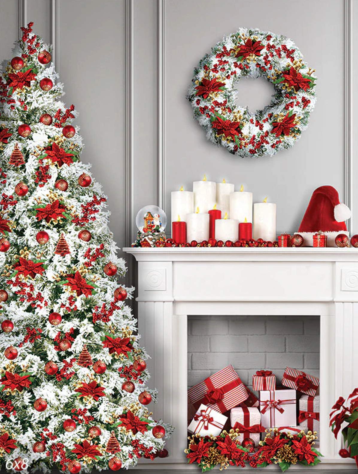 Crisp gray paneling, a flocked tree dressed in red ornaments and poinsettias, and a classic white mantel topped with glowing candles set a bright, cheerful holiday scene. Wrapped gifts and a matching wreath complete the look—perfect for family minis, kids in PJs, couples, maternity, and festive Christmas cards.