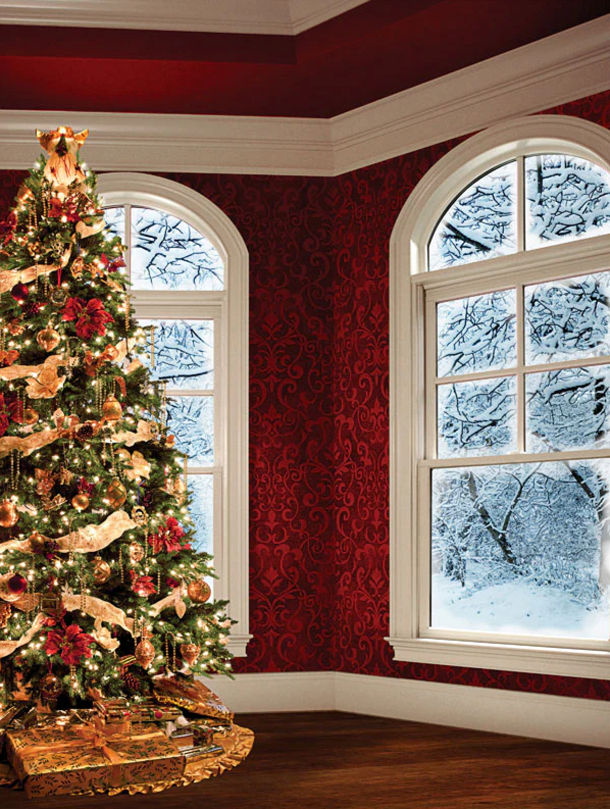 Rich red damask walls, arched windows framing a snowy landscape, and a classic tree trimmed in gold and poinsettia tones create a warm, cinematic holiday scene. Elegant yet cozy, it’s perfect for dressy family portraits, couples, maternity, luxe Christmas cards, and festive children’s sessions.