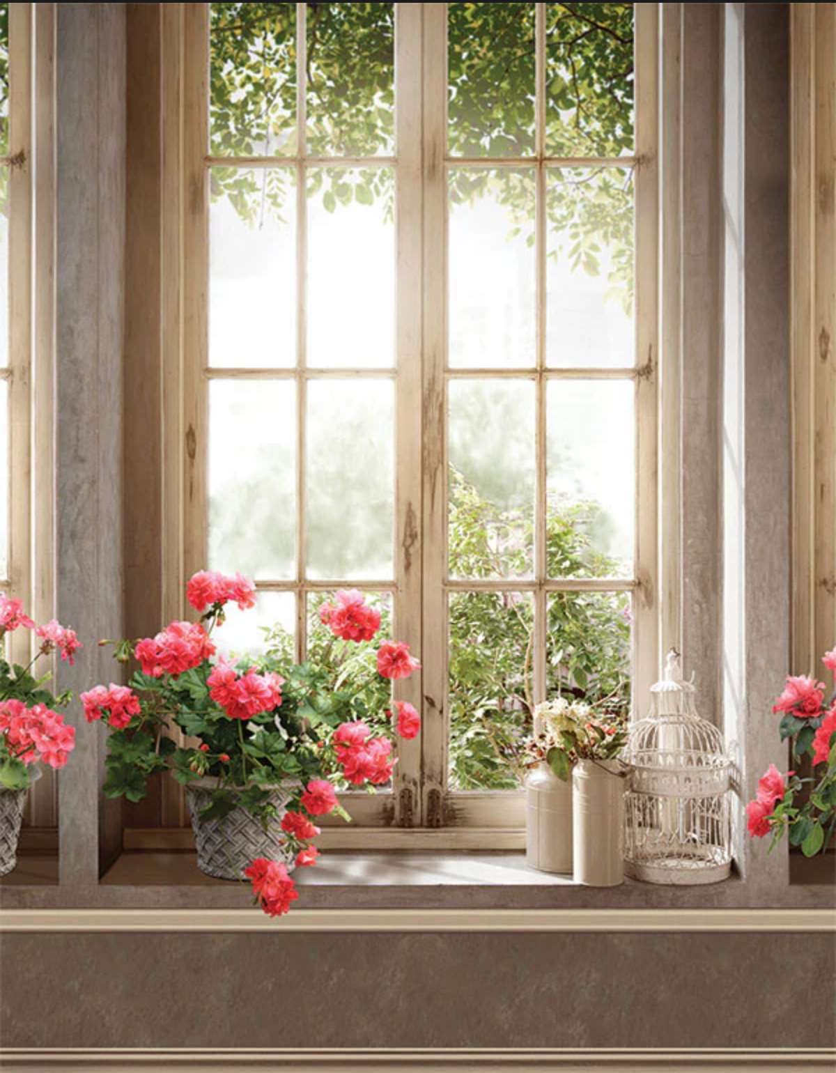 Sunlit panes, weathered wood, and climbing greenery frame a charming windowsill dotted with coral blooms and a vintage birdcage. The scene feels airy and romantic—like a quiet morning in a French cottage—giving portraits a warm, storybook glow. Perfect for spring minis, mommy-and-me, bridals, maternity, seniors, and timeless children’s sessions.